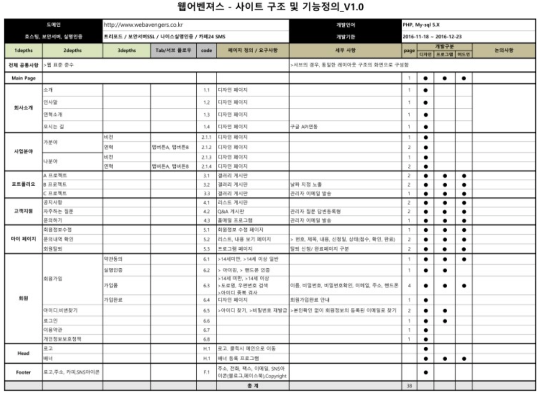 설계서 상단을 보면 도메인, 개발언어, 호스팅, 개발 기한이 적혀져 있습니다.
