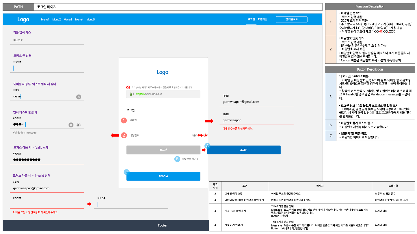 이메일 주소를 입력하는 기능에서는 택스트가 몇 글자로 입력 제한되는지, 기호 혹은 숫자 사용이 가능한지, 유효성 체크 방식 등 내부적으로 동작하는 자세한 기능을 작성합니다.