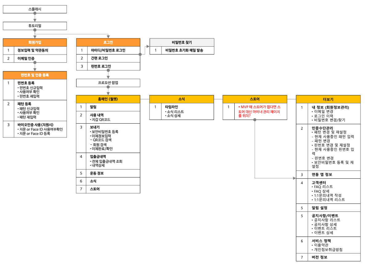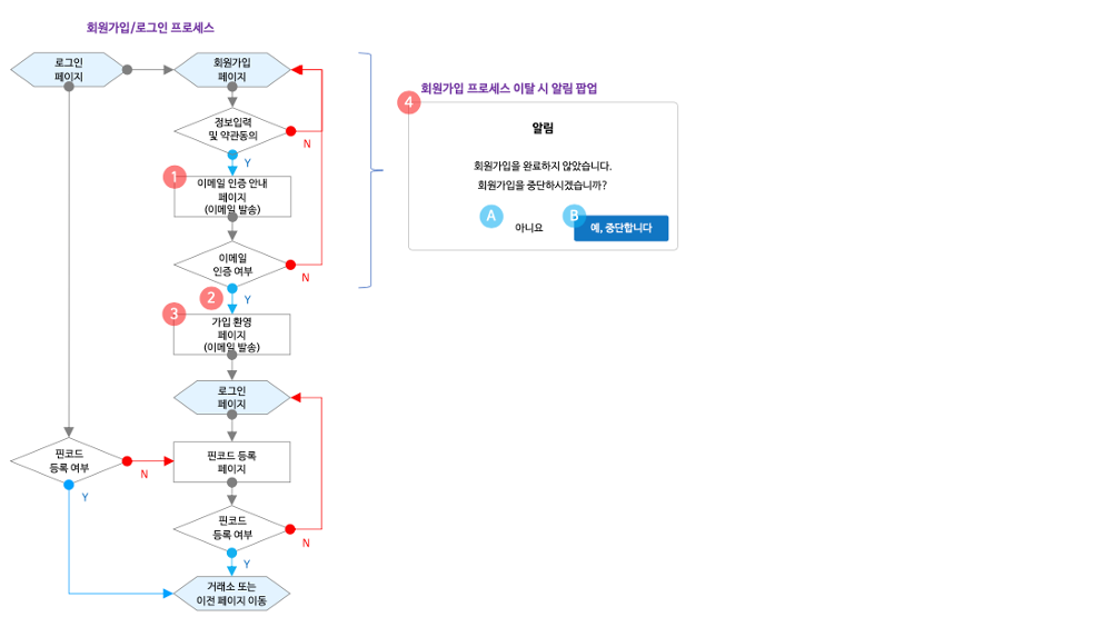기능에 대한 흐름을 표시하며 Y/N를 구분하여 어떤 화면으로 넘어가는지,