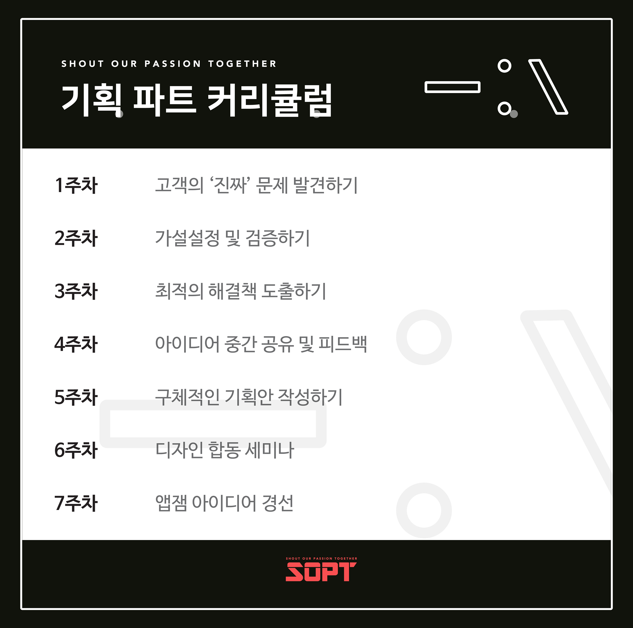 기획을 제대로 공부하고 싶었다. 그러나 이를 제대로 공부할 곳은 생각보다 많지 않았다. 여러 곳을 찾아보다, IT 창업 동아리인 'SOPT'라는 곳을 알게 되었고 기획파트원으로 약 4개월간 활동을 시작한다.