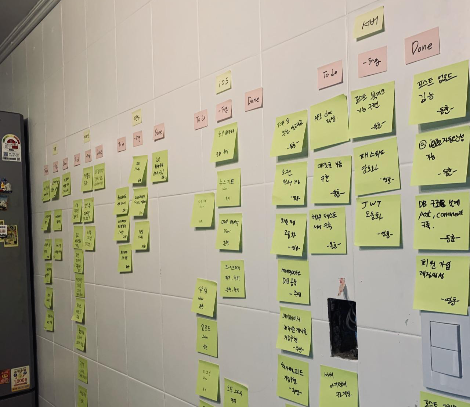 프로젝트를 진행하면서 하루에 한번씩, 각 파트들과 모여 데일리 미팅을 진행했다. 짜여진 일정을 칸반보드 형식으로 가장 잘 보이는 위치에 배치시켜 일정을 맞춰 나갔으며 이를 토대로 데일리 스크럼을 진행함으로써 진행 과정에서 발생한 이슈들과 문제들 혹은 개발 일정을 수정해나갔다.