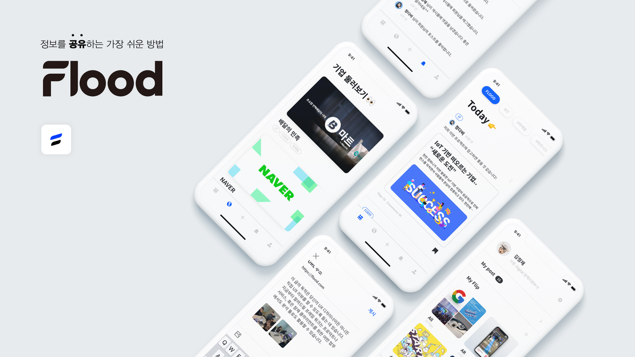 사실 블루는 신뢰를 뜻하는 색으로 정보의 신뢰성을 중요시하며 나아가 넘쳐나는 정보 안에 Flood 어플리케이션이 있다는 의미를 내포한다. 그렇게 정한 이름 "정보를 공유하는 가장 쉬운 방법, Flood"의 최종 디자인이 정해진다.