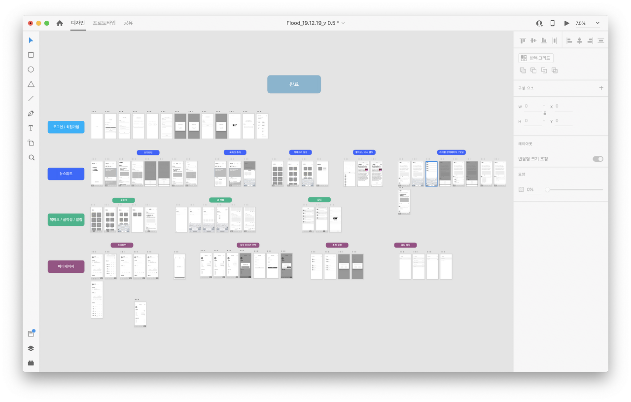 이렇게 구성된 화면을 바탕으로 디자이너와 협업을 통해 최종적으로 와이어프레임 수정 작업에 들어가며 이후 GUI(graphical user interface)작업을 통해 화면의 색을 입힌다.