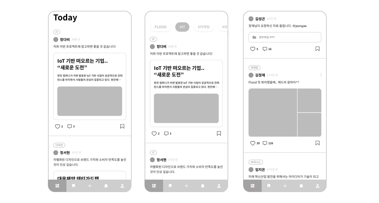 이렇게 참고한 레퍼런스로 화면을 구성해 나가는데, 내 서비스의 경우 "정보"를 공유하는 어플리케이션이기에 세 가지의 기능을 더했다.