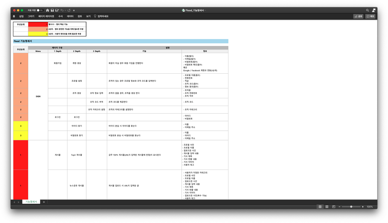 사실 앱잼이라는 특성상 IA를 통한 개발자들과의 소통이 거의 없기에, 각 페이지별로 필요한 정보(data)와 2주라는 짧은 기간 동안 기능적인 우선순위를 적어두는 방식으로 작성을 했다.