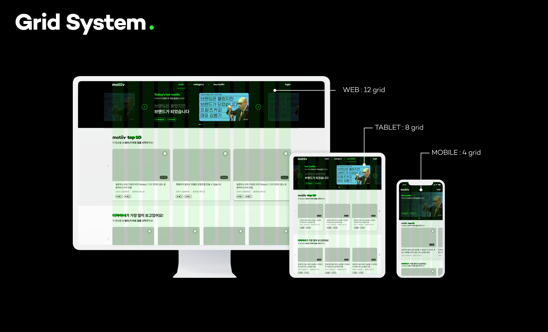 Motiiv는 다양한 환경과 디바이스에서 사용하는 웹 어플리케이션의 특징에 맞춰 PC. Tablet. Mobile에 모두 최적화된 디자인을 완성했다.
