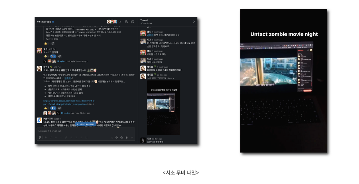 대면으로 일하는 회사의 경우 점심시간 혹은 회식을 통해 팀원들과 유대감을 쌓는 반면, 비대면의 경우 일적인 커뮤니케이션 이외의 공감을 이루기에는 어렵다. 이러한 문제들을 해결하기 위해 우리는 온라인으로 여러 활동들을 진행하며 이를 통해 공동체 의식과 소속감을 증진시키고 있다. (물론 자발적으로)