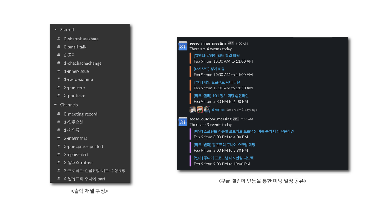 아래 보이는 사진처럼, 구글 캘린더와의 연동을 통해 매일 오전 그 날 어떤 미팅 일정이 잡혀있는지 스케줄을 한눈에 보여준다. 이 뿐만 아니라 근무 예정 시간과 휴가 일정의 경우 자체적인 백오피스에 기록하게 되는데, 이를 연동시켜 매일 팀원들이 언제 일하는지와 휴가 여부를 한눈에 보여준다.