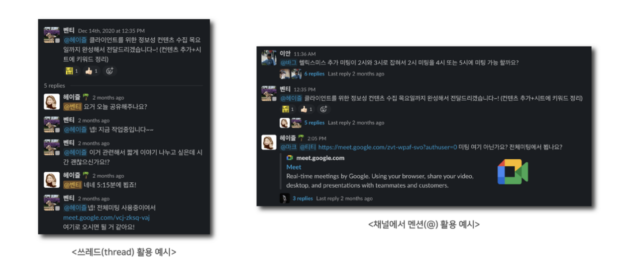 대화 내용에 있어 누군가에게 필요한 내용이 있다면 반드시 멘션을 통해 내용에 대한 알림이 가도록 유도한다. 멘션을 사용하지 않을 경우 수많은 채널들에서 커뮤니케이션이 일어나기 때문에 놓치기 쉬우며 일일이 채널에 들어가 찾아봐야 한다는 문제점이 있다. 또한 멘션을 이용할 경우 Thread를 통해 대화 내용이 자동으로 정렬되기 때문에 내용을 다시 찾아보기 수월하다.