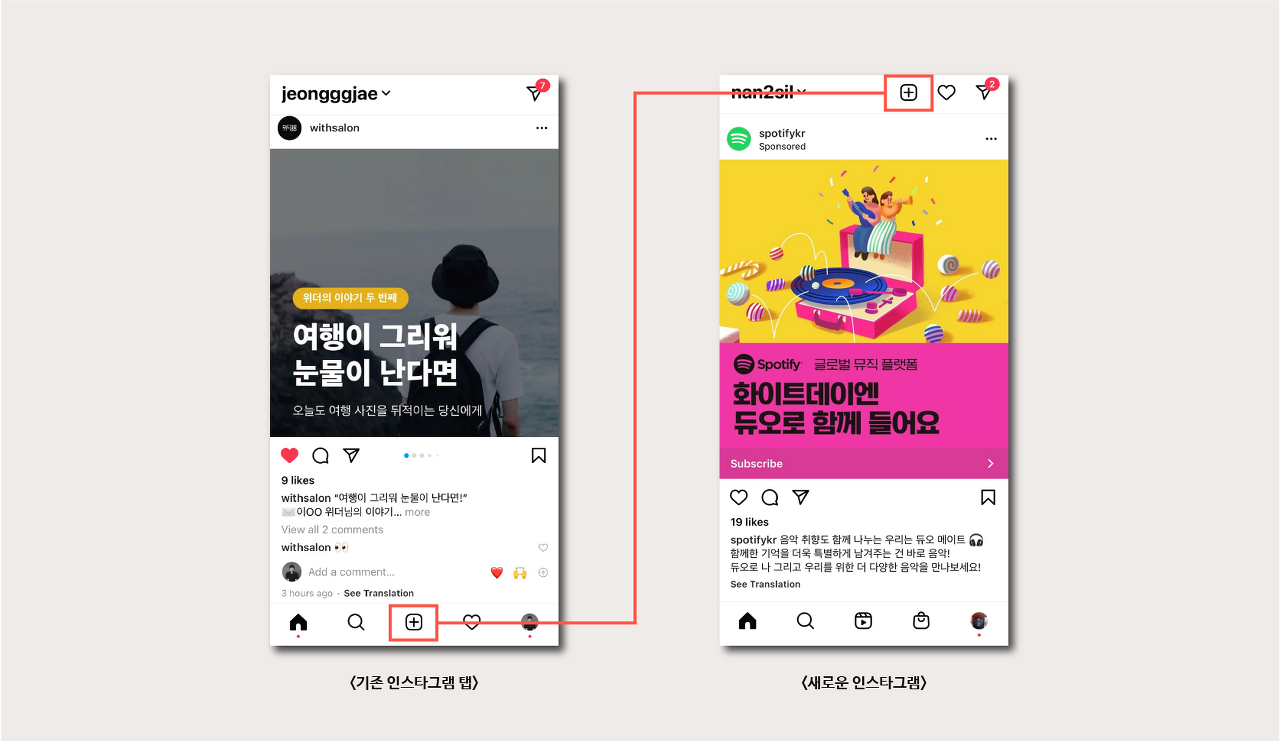 개인적으로 인스타그램을 지인이 올린 스토리나 게시물을 살펴보고 일상을 공유하는 기능을 주력으로 사용하는데, 업로드 버튼이 탭에서 사라졌다는 점 때문에 약간의 충격을 받았다.